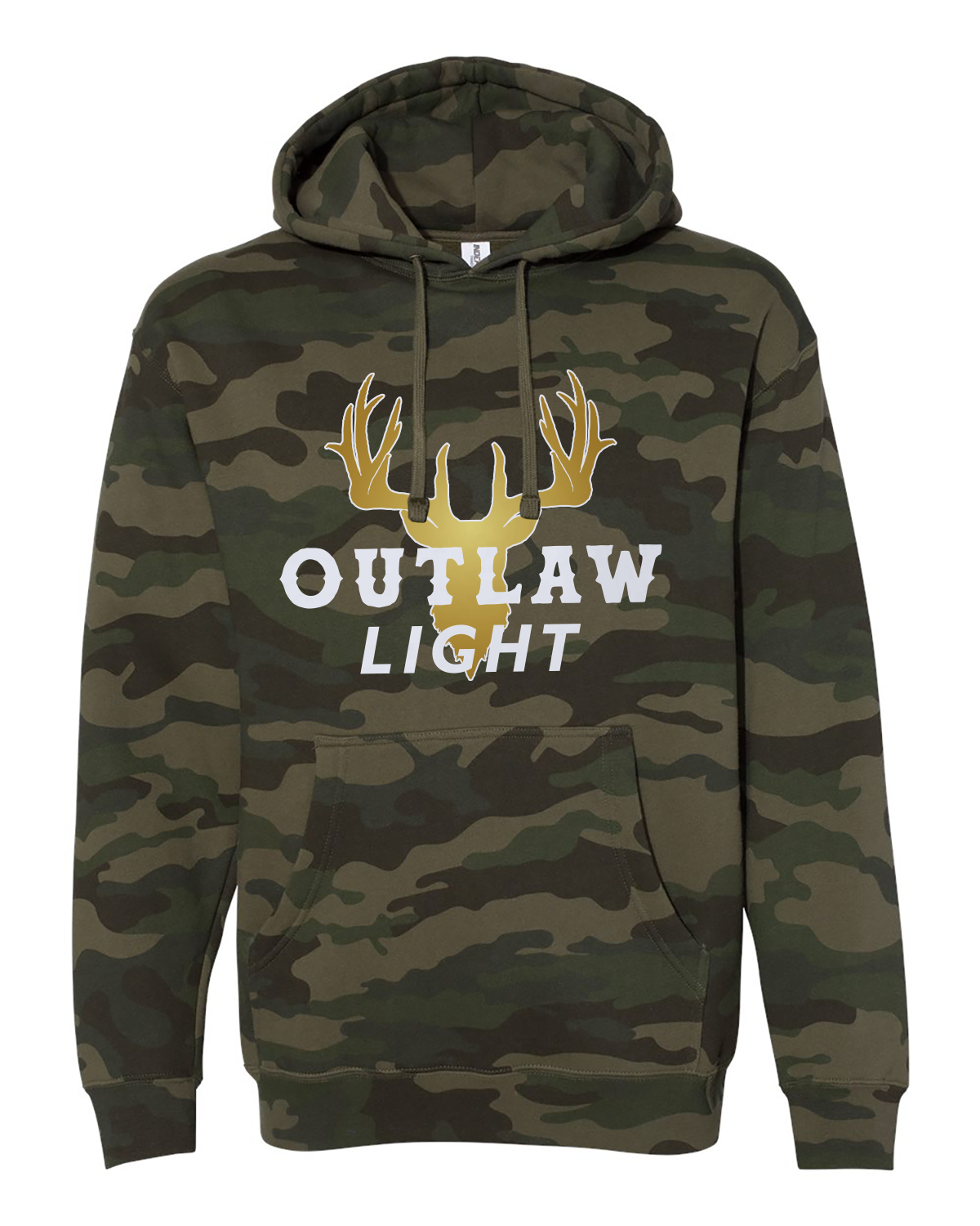 Built for cold mornings, late nights, and everything in between. The Outlaw Light Camo Hoodie delivers heavyweight comfort with an edge—featuring a classic woodland camo print and bold Outlaw Light antler logo front and center. Soft on the inside, tough on the outside, this hoodie is made for tailgates, bonfires, and post-game beers.